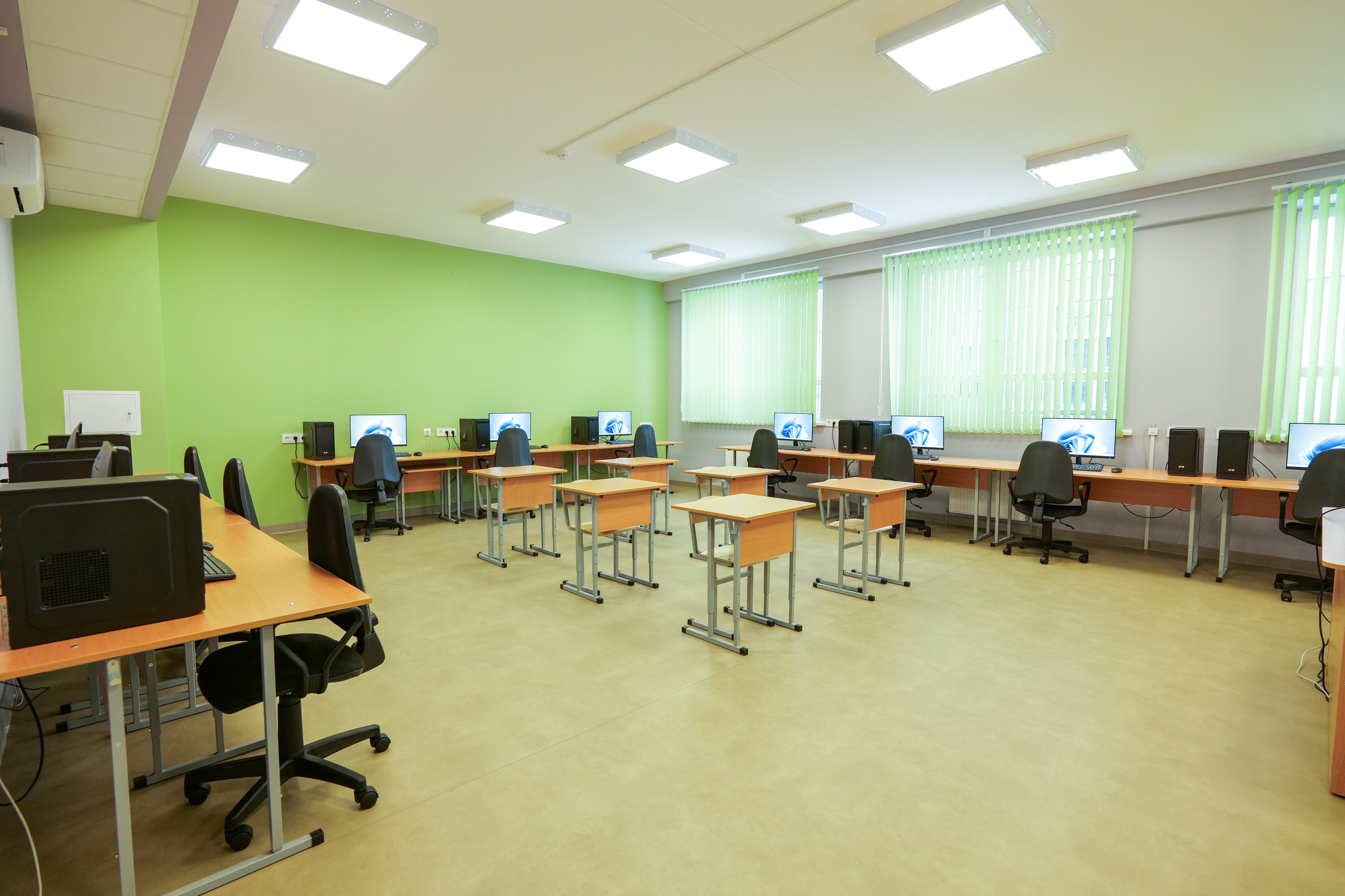 Просторные кабинеты оснащены всем необходимым оборудованием для проведения уроков на высоком цифровом уровне. Для уроков биологии создан «класс» под открытым небом с партами и «ковром» из травы, а на цокольном этаже разместится тир для уроков допризывной подготовки.