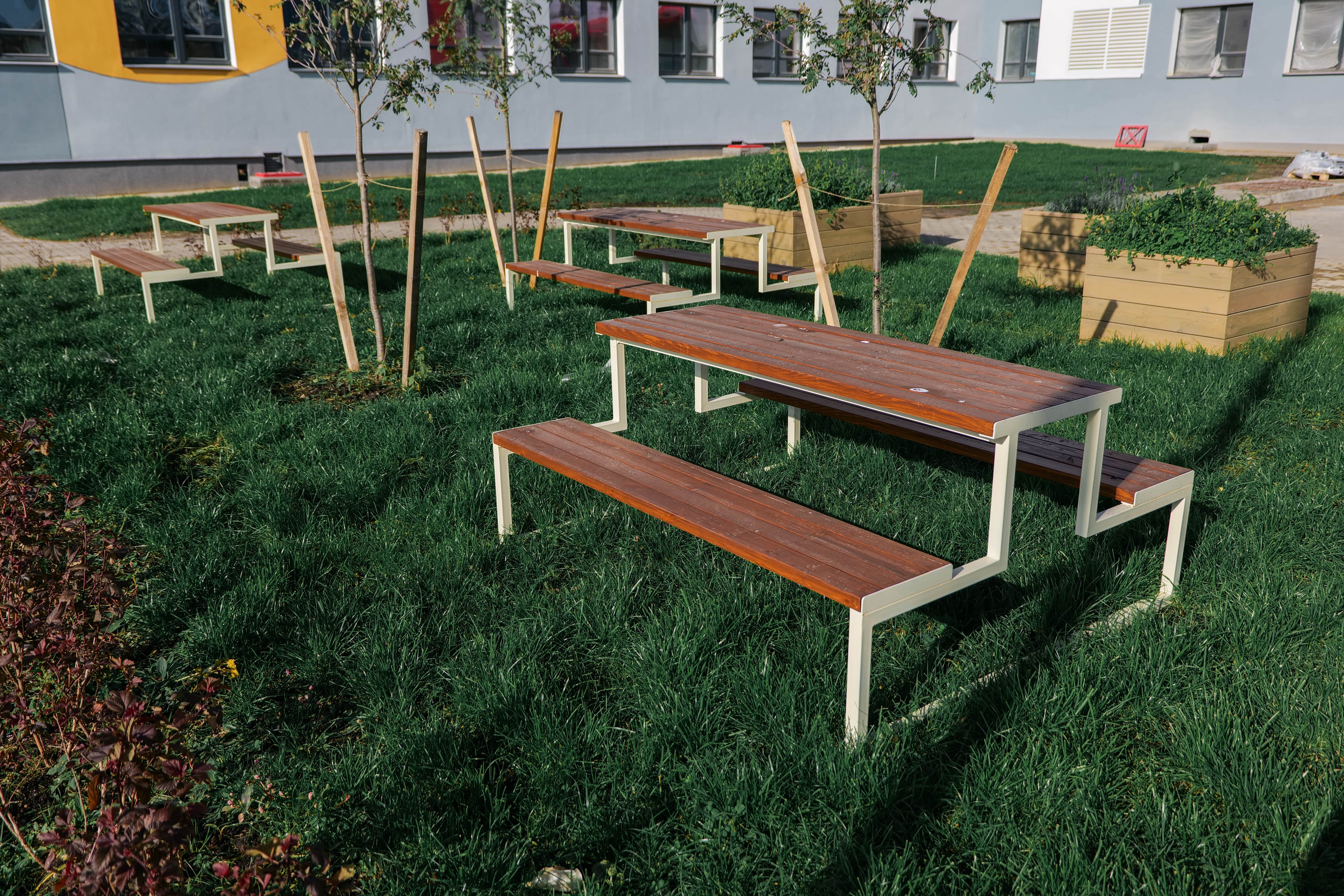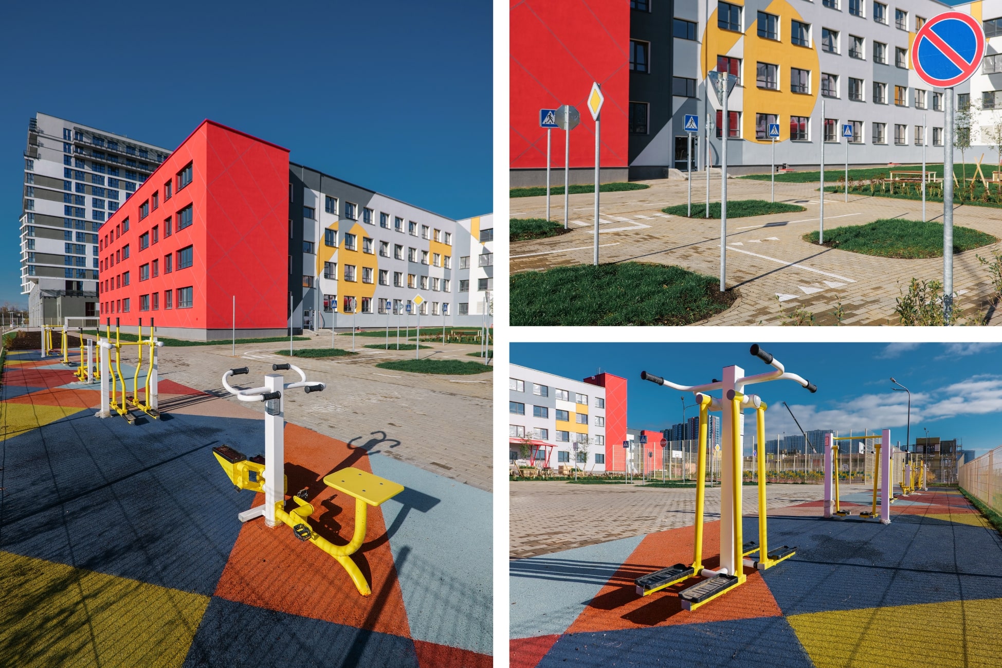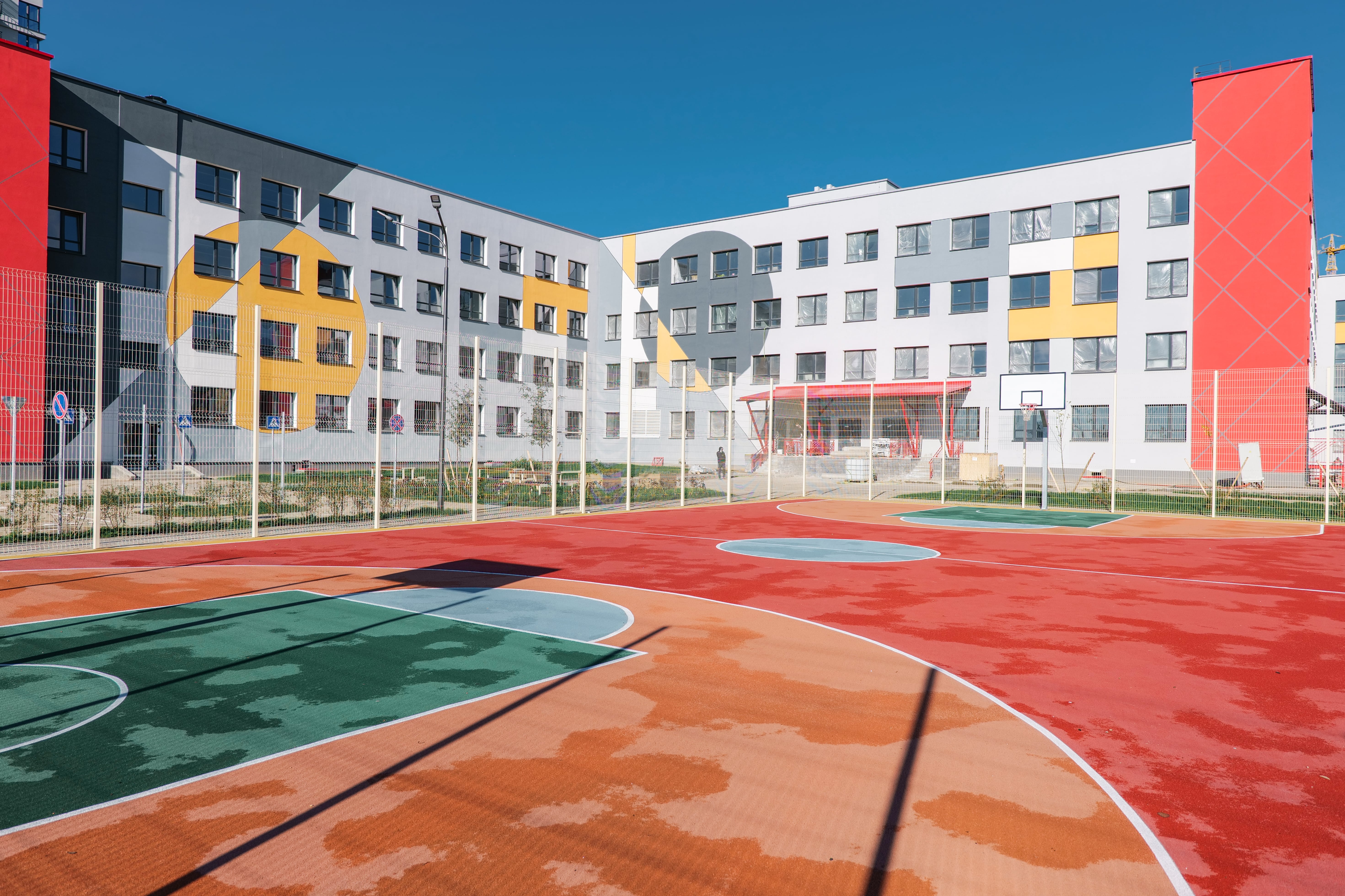 Вся спортивная зона – от уличных тренажеров до площадок для гимнастики – имеет мягкое прорезиненное покрытие, которое защищает детей от травм. Продумана и обучающая среда на свежем воздухе: для младших школьников создана специальная площадка для изучения правил дорожного движения в игровой форме.