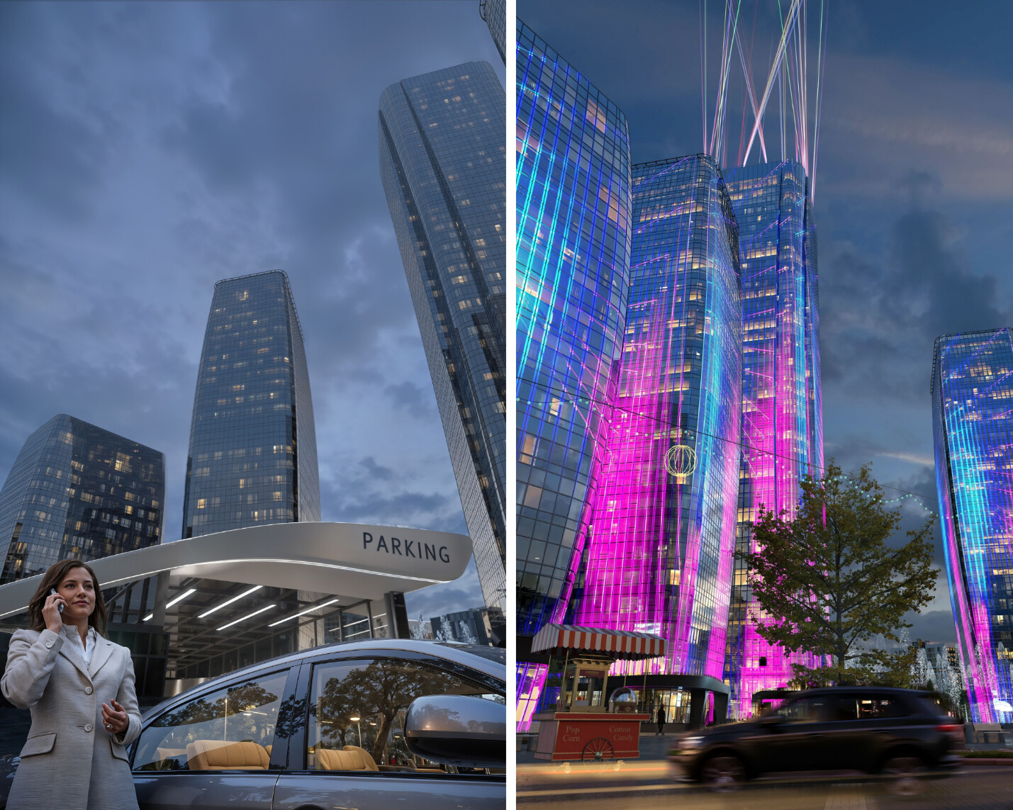 Уже сегодня МФКЦ виден из самых разных районов столицы. На самом верху расположится обзорная площадка, фасады башен будут объединены в синхронизированный медиафасад, а вечерние лазерные шоу будут видны горожанам на расстоянии до 12 километров.
