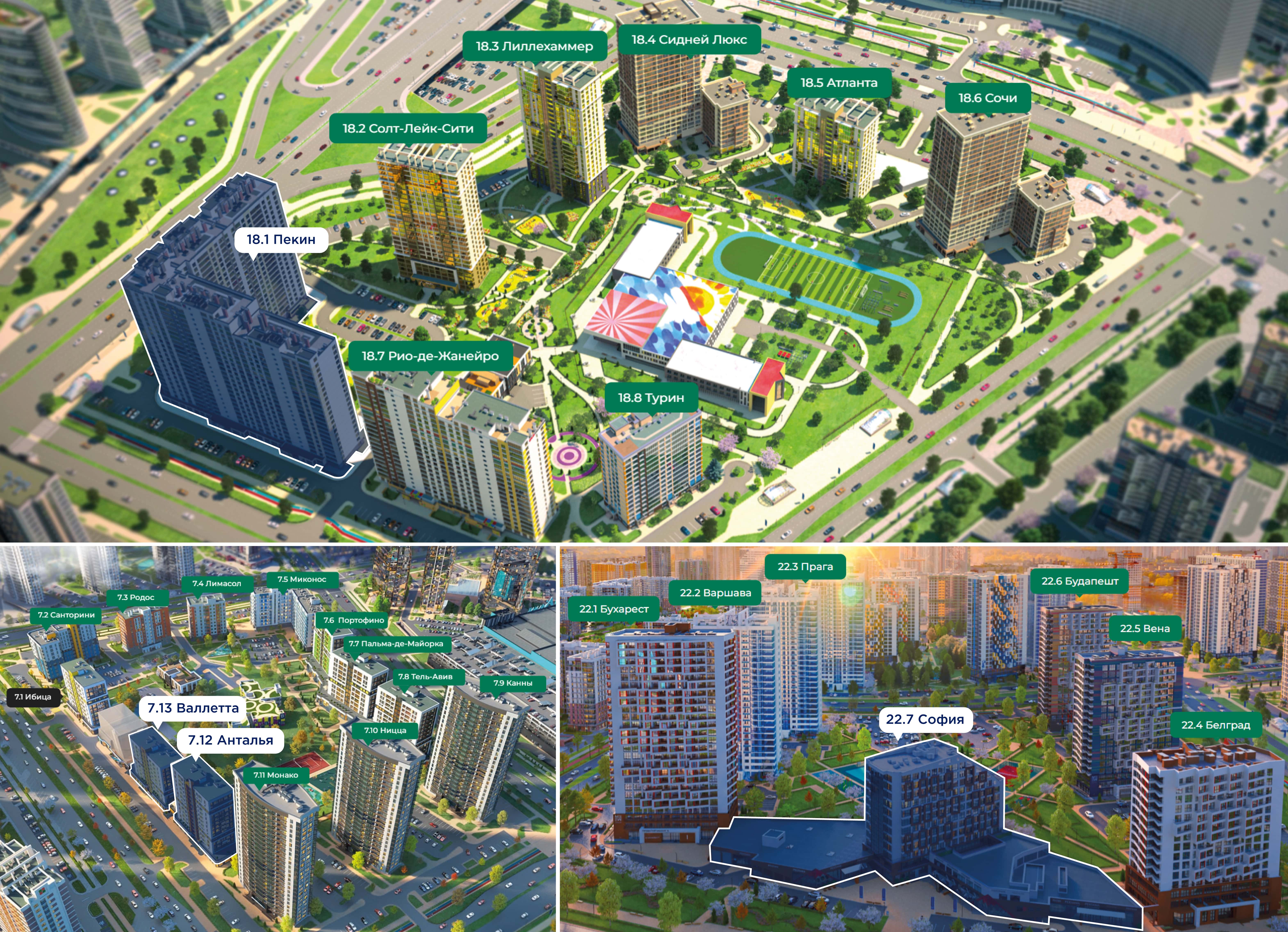 В «Софии» – просторные террасы, невысокая этажность и выгодное расположение. В «Пекине» – энергия спортивного квартала и впечатляющая этажность. В «Анталии» и «Ла Валлетте» – уют средиземноморского стиля.